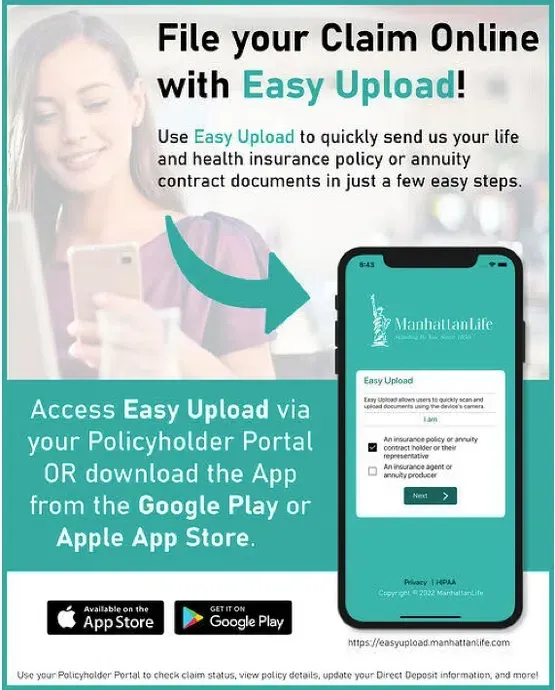 The Easy Upload mobile app or the Easy 1 Column Form Upload tool found on the Client Services site can be used to securely send documents to us regarding a specific Life & Health policy or Annuity contract. You will need to know the policy number and the owner’s zip code to use this feature.